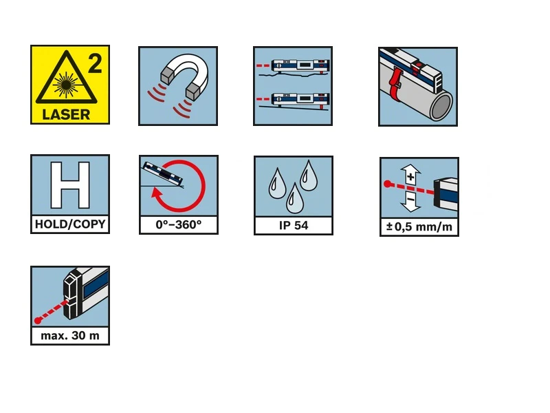 - Ingebouwde puntlaser voor de hellingsmeting tot 30 m lengte